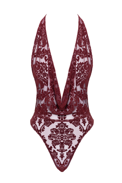 Adoptez une élégance audacieuse avec ce body bordeaux sensuel en tissu floqué, conçu pour allier sophistication et audace. Parfait pour affirmer votre style seul ou à superposer pour des looks polyvalents.
